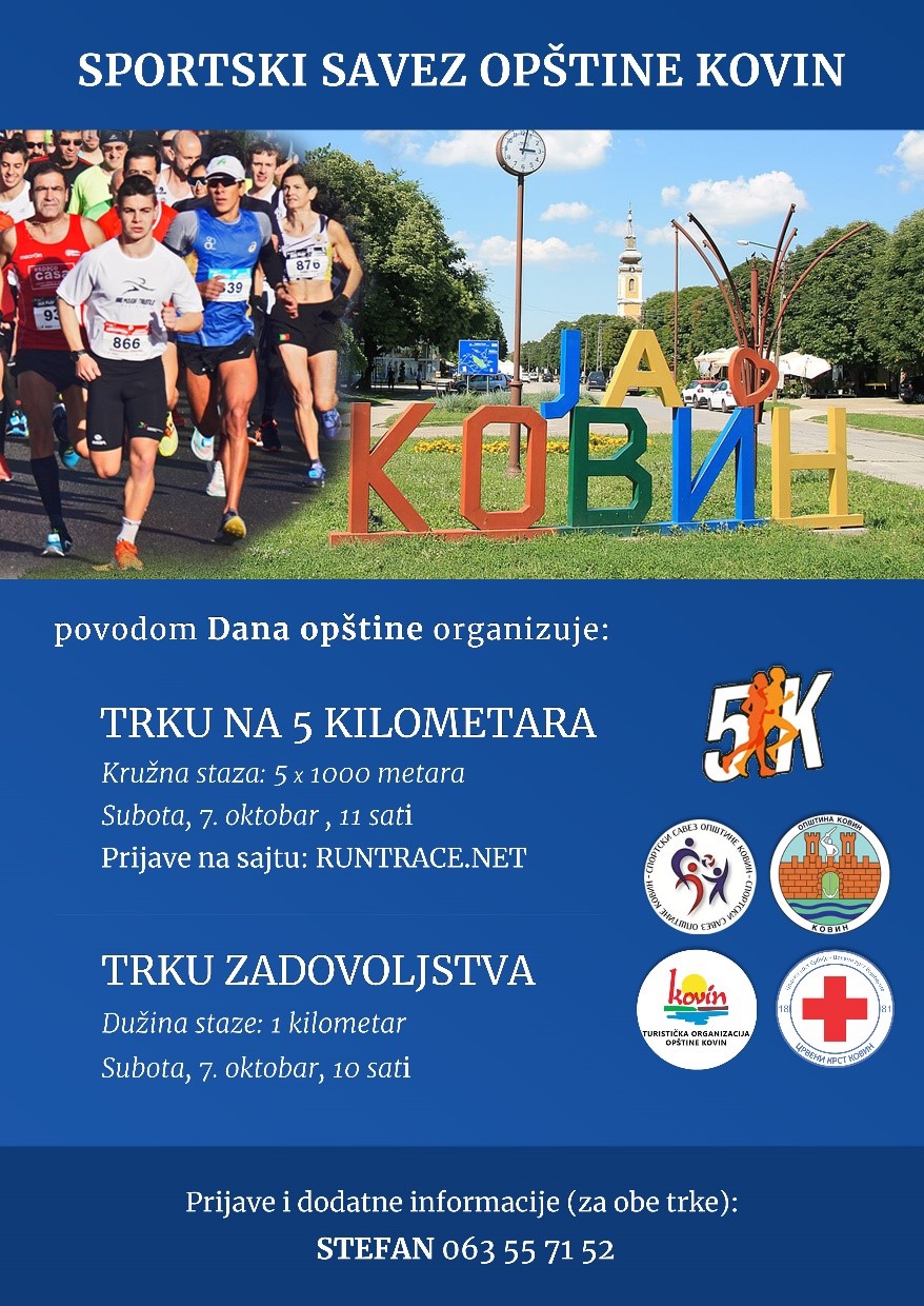 У оквиру овогодишњег обележавања празника општине, Спортски савез општине Ковин организује 7. октобра 2023 – субота, Трку на 5 километара и Трку задовољства, са циљем промоције здравог начина живота и указивања на значај бављења спортом. Организатори позивају све суграђане, без обзира на године, да својим учешћем подрже акцију Спортског савеза општине Ковин, да сви заједно покажемо колико су активности попут трчања, ходања, шетања – важне за наше опште здравље.