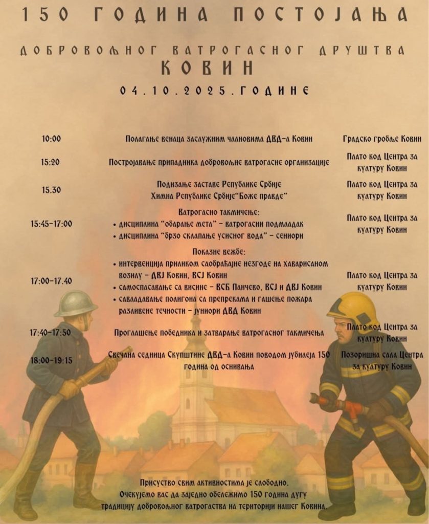 У суботу, 4. октобра 2025. године свечано ће се обележити 150 година постојања Добровољног ватрогасног друштва Ковин. Овај значајан јубилеј обележава се у знак сећања на дугу и богату традицију добровољног ватрогаства на територији наше општине, као и...