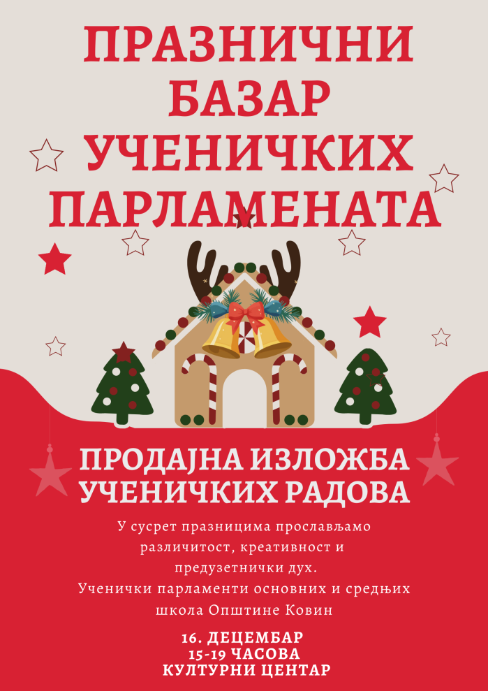 Ученички парламенти основних и средњих школа Општине Ковин позивају све суграђане на други по реду „Празнични базар ученичких парламената“, који ће бити одржан 16. децембра у Центру за културу Ковин од 15 до 19 часова.