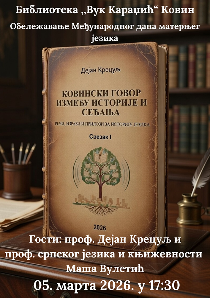 У четвртак 5.марта у 17.30 часова у библиотеци у Ковину биће представљен „Ковински говор између историје и сећања“, аутора проф. Дејана Крецуља, а модератор програма биће проф. српског језика и књижевности Маша Вулетић. Овај подухват је започет као лична мисија очувања баштине и прерастао је у својеврсну „народну читанку“. Бележе се германизми, хунгаризми, романизми и оријентализми, који су се у Ковину стопили у јединствен локални језички слој.