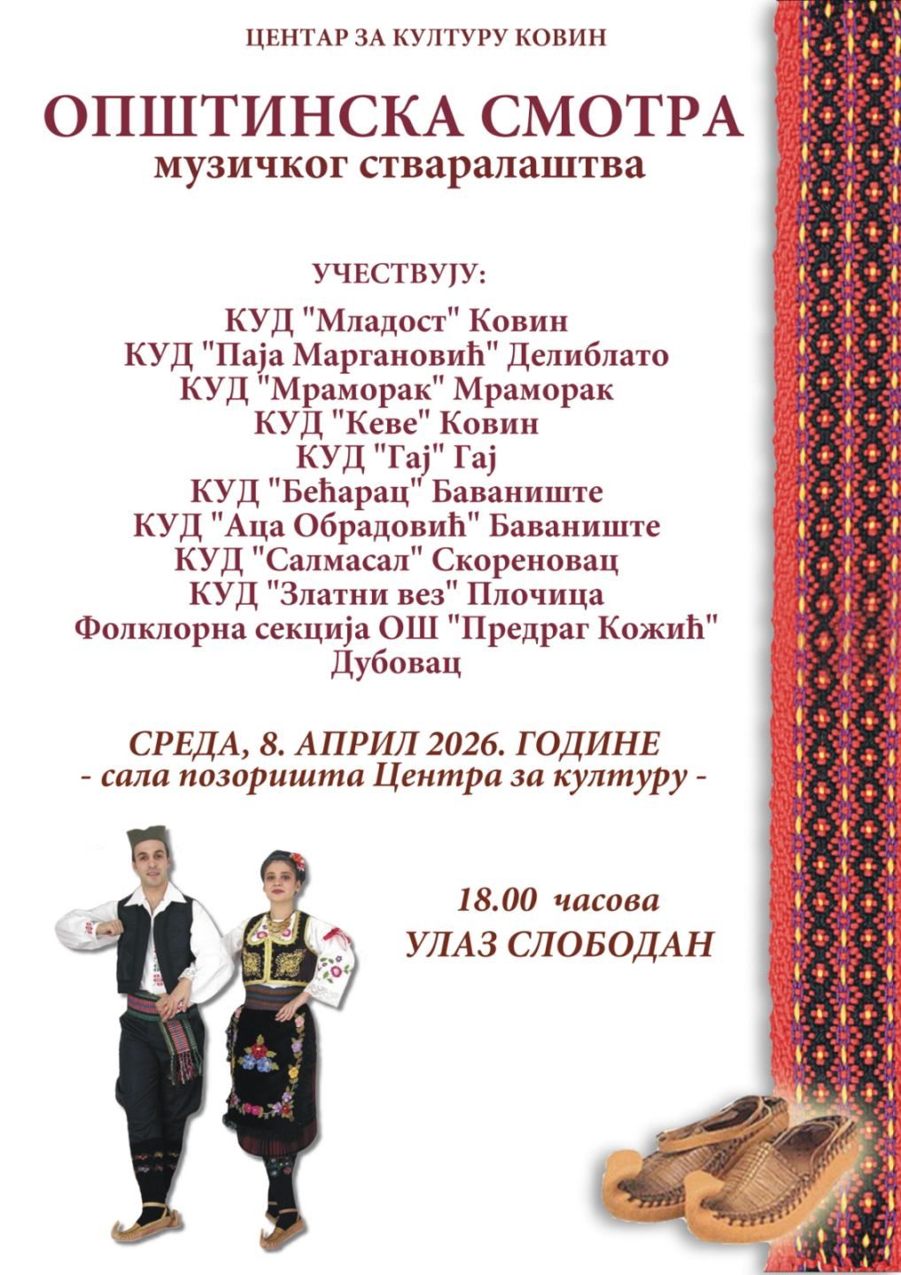 На смотри ће наступити: културно уметничка друштва „Младост“ из Ковина, „Паја Маргановић“ из Делиблато, Мраморак“ из Мраморка, „Кеве“ из Ковина, „Гај“ из Гаја, „Бећарац“ и „Аца Обрадовић“ из Баваништа„Салмасал“ из Скореновца „Златни вез“ из Плочице и фолклорна секција ОШ „Предраг Кожић“ из Дубовца, са више од 200 учесника.